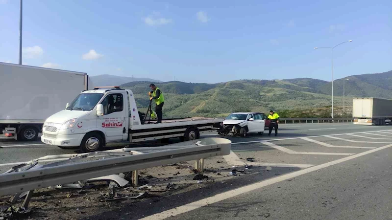 Bursa'nın Gemlik ilçesi yakınlarında İstanbul İzmir otobanında kontrolden çıkan bir otomobil bariyerlere çarptı. Bariyerleri parçalayan otomobilin motor bloğu yerinden koparak yolun diğer bölümüne savruldu. Otomobilde sürücü ile birlikte yanındaki eşi yaralı olarak hastaneye kaldırıldı.
