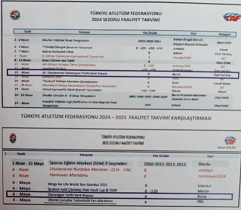 Bursa’nın 6 Nisan 1326’da Osmanlı Cihan Devleti tarafından fethi münasebetiyle her yıl nisan ayında koşulan ve Bursa’nın Fethi’ni simgeleyen Uluslararası Osmangazi Kent Koşusu amacı dışına çıkarılarak mayıs ayına alındı. 2009 yılında Tiran’daki Dünya Kaleli Kentler Birliğinin toplantısında ilçenin üyeliğe kabulüyle uluslararası statüsüne kavuşan tarihi koşunun Türkiye Atletizm Federasyonu’nun 2025 Faaliyet Takvimine de uluslararası ibaresi çıkarılarak sadece Osmangazi Tarihi Kent Koşusu olarak yazılması büyük tepki topladı.