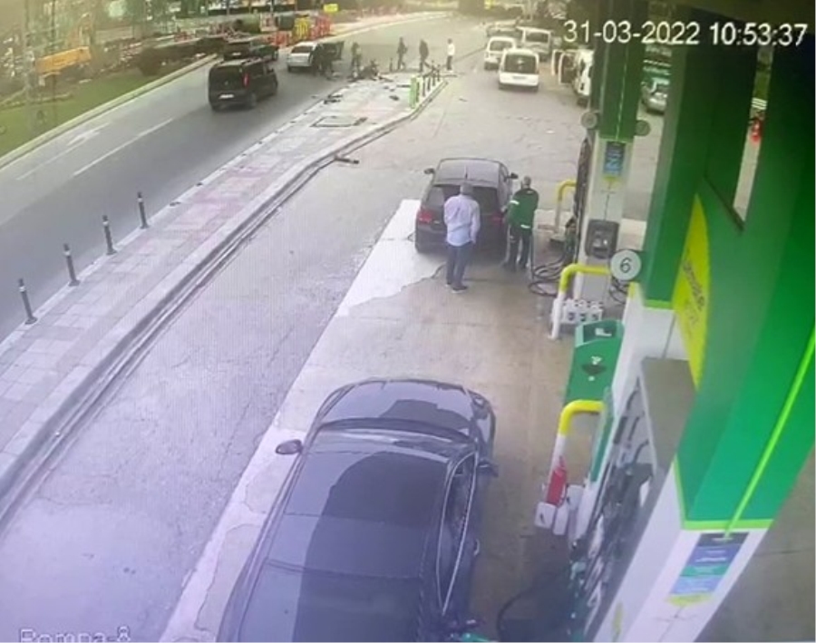 Yaşanan olay akaryakıt istasyonunun güvenlik kameralarına saniye saniye yansıdı. Görüntülerde, otomobilin çarptığı motosikletin sürüklendiği görülüyor. Yere düşen motosikletli kurye şüpheliler tarafından dövülüyor. Para dolu çantayı gasp eden şüpheliler kayıplara karışıyor.