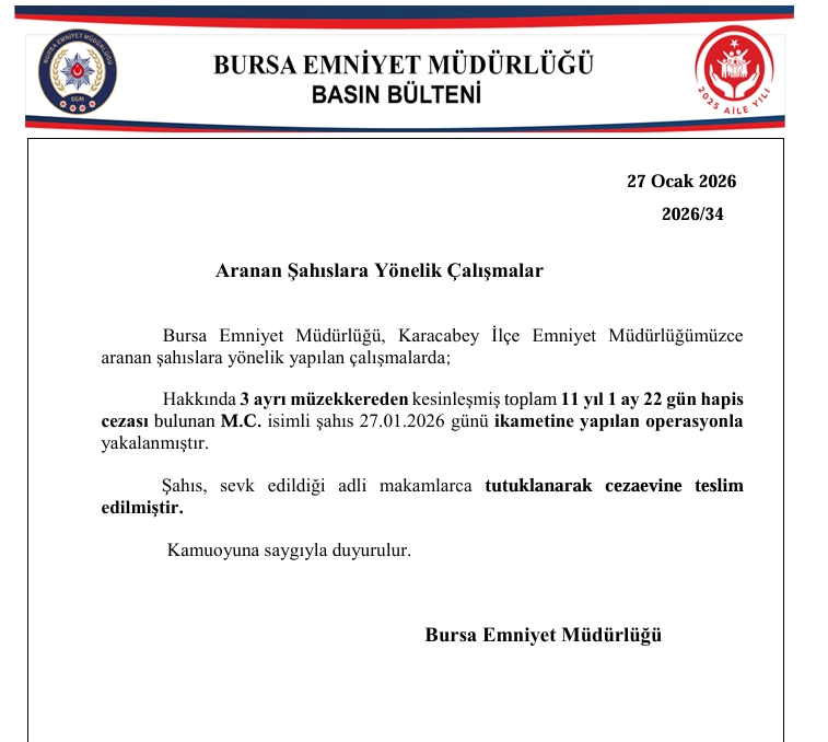 Edinilen bilgilere göre, hakkında 3 ayrı müzekkereden toplam 11 yıl 1 ay 22 gün kesinleşmiş hapis cezası bulunan M.C. isimli şahıs, 27 Ocak 2026 tarihinde ikametine düzenlenen operasyonla gözaltına alındı.