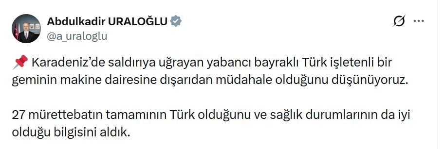 Bakan Uraloğlu, sanal medya hesabından yaptığı açıklamada, "Karadeniz'de saldırıya uğrayan yabancı bayraklı Türk işletenli bir geminin makine dairesine dışarıdan müdahale olduğunu düşünüyoruz. 27 mürettebatın tamamının Türk olduğunu ve sağlık durumlarının da iyi olduğu bilgisini aldık" ifadelerini kullandı.
