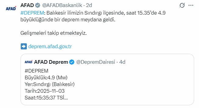 Afet ve Acil Durum Yönetimi Başkanlığı (AFAD) tarafından yapılan açıklamaya göre saat 15.35'te merkez üssü Balıkesir'in Sındırgı ilçesinde 4.9 büyüklüğünde bir deprem meydana geldi.