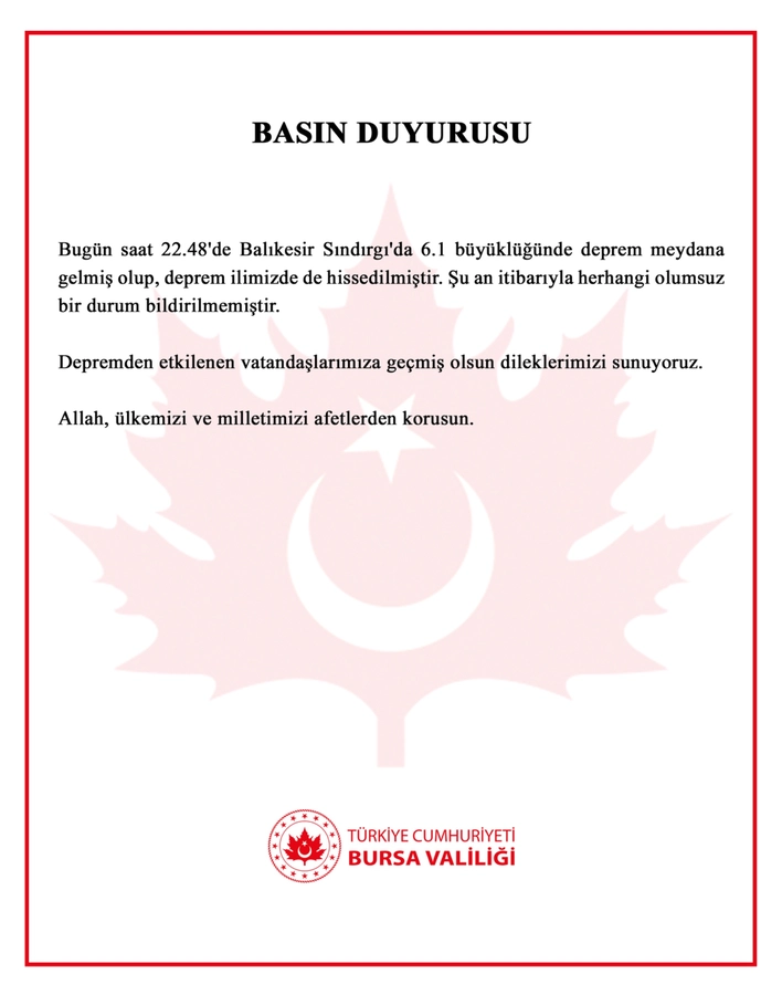 “Bugün saat 22.48'de Balıkesir Sındırgı'da 6.1 büyüklüğünde deprem meydana gelmiş olup, deprem ilimizde de hissedilmiştir. Şu an itibarıyla herhangi olumsuz bir durum bildirilmemiştir.