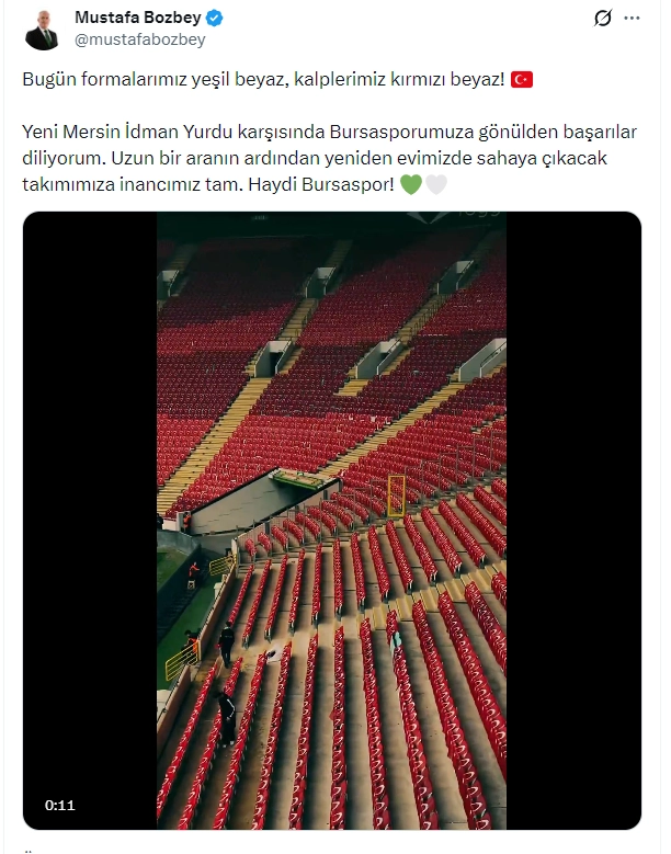 Başkan Bozbey, sosyal medya hesabından yaptığı paylaşımda Bursaspor’a olan inancını vurgulayarak, “Bugün formalarımız yeşil beyaz, kalplerimiz kırmızı beyaz. Yeni Mersin İdman Yurdu karşısında Bursasporumuza gönülden başarılar diliyorum. Uzun bir aranın ardından yeniden evimizde sahaya çıkacak takımımıza inancımız tam. Haydi Bursaspor” ifadelerini kullandı.
