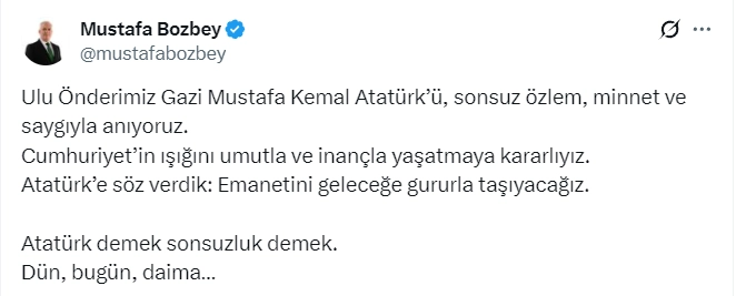 "Ulu Önderimiz Gazi Mustafa Kemal Atatürk’ü sonsuz özlem, saygı ve minnetle anıyoruz. Bize emanet ettiği Cumhuriyet, gösterdiği hedefler ve ışık tuttuğu yol bugün de rehberimizdir. Onun azmi, vizyonu ve milletine olan inancı, her adımımızda yaşamaya devam ediyor."
