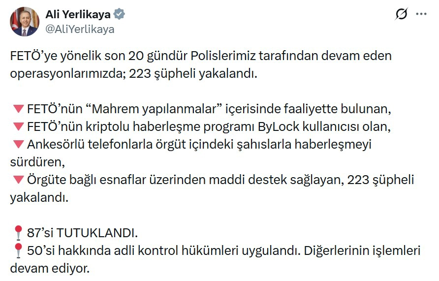"FETÖ'ye yönelik son 20 gündür polislerimiz tarafından devam eden operasyonlarımızda; 223 şüpheli yakalandı. FETÖ'nün "Mahrem yapılanmalar" içerisinde faaliyette bulunan, FETÖ'nün kriptolu haberleşme programı ByLock kullanıcısı olan, Ankesörlü telefonlarla örgüt içindeki şahıslarla haberleşmeyi sürdüren, Örgüte bağlı esnaflar üzerinden maddi destek sağlayan, 223 şüpheli yakalandı. 87'si TUTUKLANDI. 50'si hakkında adli kontrol hükümleri uygulandı. Diğerlerinin işlemleri devam ediyor. Cumhuriyet Başsavcılıklarımız ile EGM TEM Daire Başkanlığımız, KOM ve İstihbarat Başkanlıklarımız koordinesinde; Emniyet Müdürlükleri TEM ve KOM Şube Müdürlüklerince; Antalya, Amasya, Ankara, İzmir, Yalova, İstanbul, Edirne, Konya, Sakarya, Mersin, Kocaeli merkezli Adana, Afyonkarahisar, Aydın, Aksaray, Balıkesir, Bursa, Bolu, Çanakkale, Çorum, Denizli, Elazığ, Eskişehir, Erzurum, Gaziantep, Hatay, Iğdır, Isparta, Kahramanmaraş, Kastamonu, Kayseri, Kırıkkale, Kütahya, Manisa, Muğla, Nevşehir, Niğde, Osmaniye, Sivas, Şanlıurfa, Tekirdağ, Trabzon, Uşak, Yozgat ve Zonguldak'ta gerçekleştirilen operasyonlarda; haklarından kesinleşmiş hapis cezası ve aranma kaydı bulunanlar da yakalandı." ifadelerini kullandı.