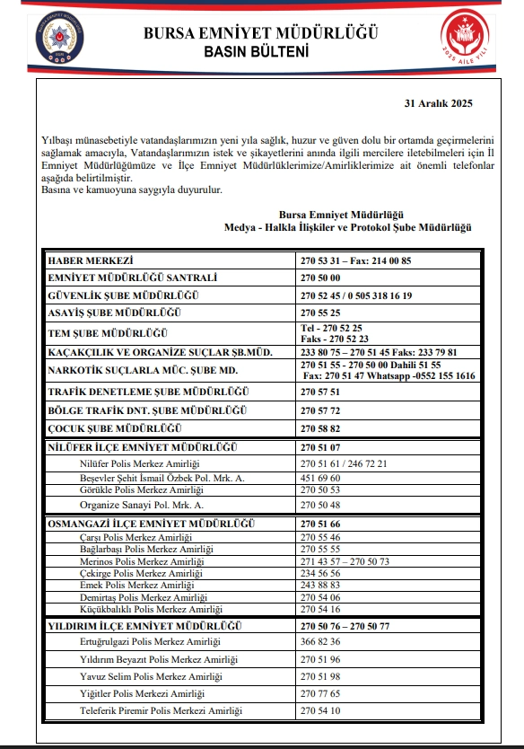 Bursa Emniyet Müdürlüğü, yılbaşı gecesi vatandaşların huzur ve güvenliği için tüm birimleriyle görev başında olurken, acil durumlar için önemli iletişim hatlarını paylaştı.