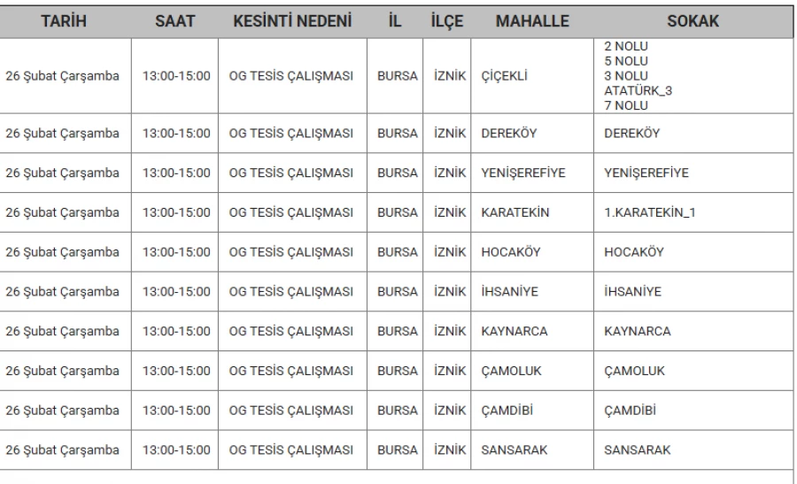 Bursa'da 26 Şubat 2025 Çarşamba günü İnegöl, İznik, Karacabey, Mustafakemalpaşa, Nilüfer, Orhangazi, Osmangazi, Yenişehir ve Yıldırım ilçelerinde planlı elektrik kesintileri yapılacak.