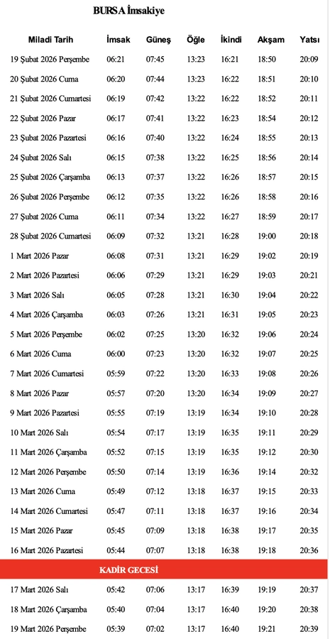 19 Şubat 2026 tarihinde Bursa için belirlenen vakitler şöyle: