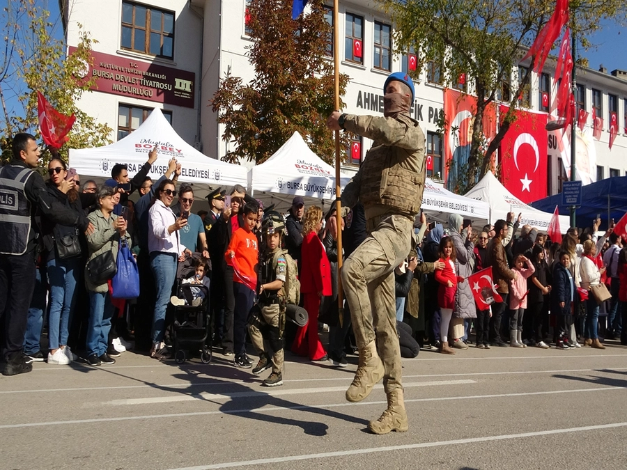 Törene Bursa Valisi Erol Ayyıldız, Büyükşehir Belediye Başkanı Mustafa Bozbey, Cumhuriyet Başsavcısı Ramazan Solmaz, İl Emniyet Müdürü Kadir Gökce, İl Jandarma Komutanı Tümgeneral İdris Tataroğlu, Bursa milletvekilleri, siyasi parti temsilcileri ve çok sayıda vatandaş katıldı. Saygı duruşu, İstiklal Marşı’nın okunması ve Türk bayrağının göndere çekilmesinin ardından Vali Ayyıldız, Bursalıların Cumhuriyet Bayramı’nı kutladı. Halk oyunları ekipleri, Mehter takımı ve Kılıç Kalkan ekibinin gösterilerinin ardından, tören, kortej yürüyüşü ile sona erdi.