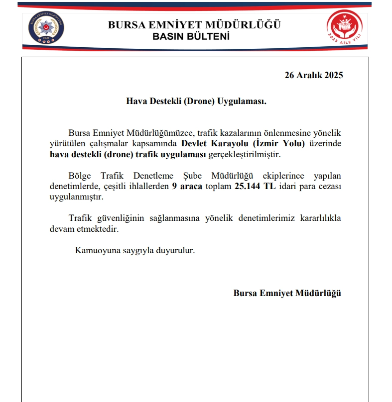 Bursa Emniyet Müdürlüğü’nden yapılan açıklamada, trafik güvenliğinin sağlanmasına yönelik denetimlerin kararlılıkla sürdürüleceği vurgulandı.