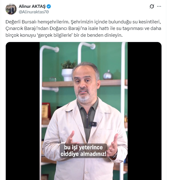 Bozbey yönetimini eleştiren Aktaş, “Mustafa Bozbey, su işi ciddi bir iştir. Devlette devamlılık esastır. Siz göreve geldikten sonra projeyi Eylül 2025’te bitirecek bir iradenin devamı olarak bu işi yeterince ciddiye almadınız... Sizin zaten 20 günlük işi kalan Hanlar Bölgesi otoparkını 1.5 yıl sonra açtığınızı bütün Bursa biliyor. Su işi yetişmiş ekiplerle yapılır.” ifadelerini kullandı.