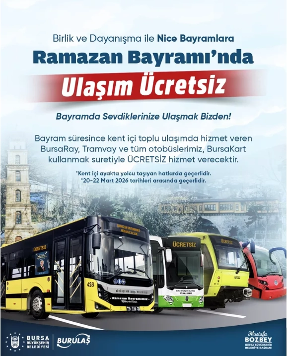 Bursa Büyükşehir Belediyesi, Ramazan Bayramı boyunca kent içi toplu taşımanın ücretsiz olacağını duyurdu. Bayram süresince BursaRay, tramvay ve belediye otobüsleri, BursaKart kullanımı şartıyla vatandaşlara hizmet verecek.