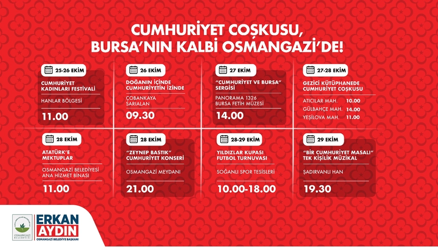 Osmangazi Belediyesi, 29 Ekim Cumhuriyet Bayramı kutlamalarının tüm ilçeyi sarması ve vatandaşların 102’nci yıl coşkusunu doyasıya yaşaması için zengin bir program hazırladı. 25 Ekim Cumartesi günü başlayacak ve 29 Ekim Çarşamba günü son bulacak etkinlikler, Osmangazi’nin dört bir yanında renkli görüntülere sahne olacak. Osmangazi Belediye Başkanı Erkan Aydın’ın yenilikçi anlayışıyla hazırlanan kapsamlı program, ilçede Cumhuriyet ruhuna yeni bir soluk kazandıracak.