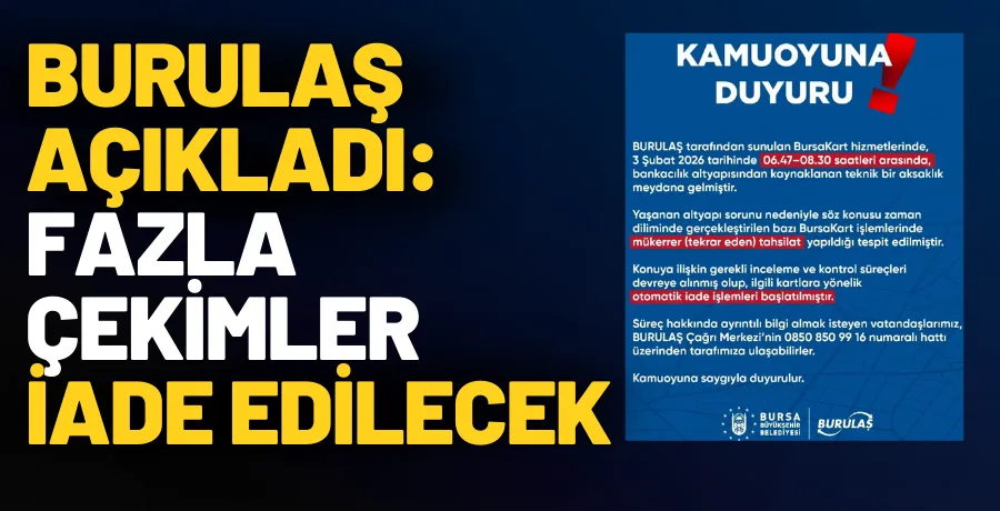 BURULAŞ’tan yapılan bilgilendirmeye göre, 3 Şubat 2026 tarihinde 06.47 ile 08.30 saatleri arasında bankacılık altyapısından kaynaklanan bir sorun meydana geldi. Bu süre zarfında gerçekleştirilen BursaKart işlemlerinde bazı yolculardan tekrar eden tahsilat yapıldığı belirlendi.