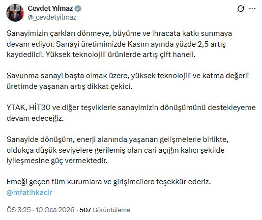 Cumhurbaşkanı Yardımcısı Cevdet Yılmaz, kasım ayı sanayi üretimi istatistiklerine ilişkin sanal medya hesabından açıklama yaptı. Yılmaz, "Sanayimizin çarkları dönmeye, büyüme ve ihracata katkı sunmaya devam ediyor. Sanayi üretimimizde kasım ayında yüzde 2,5 artış kaydedildi. Yüksek teknolojili ürünlerde artış çift haneli. Savunma sanayi başta olmak üzere, yüksek teknolojili ve katma değerli üretimde yaşanan artış dikkat çekici. YTAK, HİT30 ve diğer teşviklerle sanayimizin dönüşümünü destekleyeme devam edeceğiz. Sanayide dönüşüm, enerji alanında yaşanan gelişmelerle birlikte, oldukça düşük seviyelere gerilemiş olan cari açığın kalıcı şekilde iyileşmesine güç vermektedir. Emeği geçen tüm kurumlara ve girişimcilere teşekkür ederiz" diye konuştu.