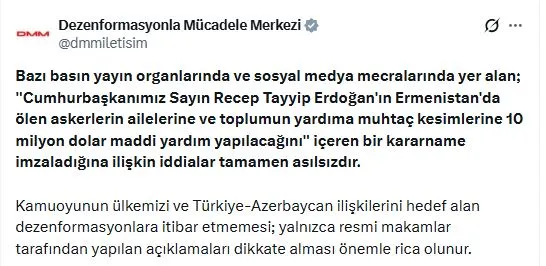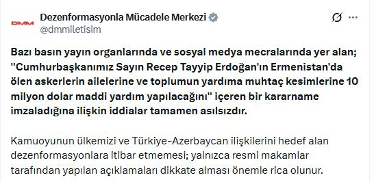 DMM'nin sosyal medya hesabından yapılan açıklamada, "Bazı basın yayın organlarında ve sosyal medya mecralarında yer alan; Cumhurbaşkanımız Sayın Recep Tayyip Erdoğan'ın Ermenistan'da ölen askerlerin ailelerine ve toplumun yardıma muhtaç kesimlerine 10 milyon dolar maddi yardım yapılacağını içeren bir kararname imzaladığına ilişkin iddialar tamamen asılsızdır. Kamuoyunun ülkemizi ve Türkiye-Azerbaycan ilişkilerini hedef alan dezenformasyonlara itibar etmemesi; yalnızca resmi makamlar tarafından yapılan açıklamaları dikkate alması önemle rica olunur" ifadelerine yer verildi.