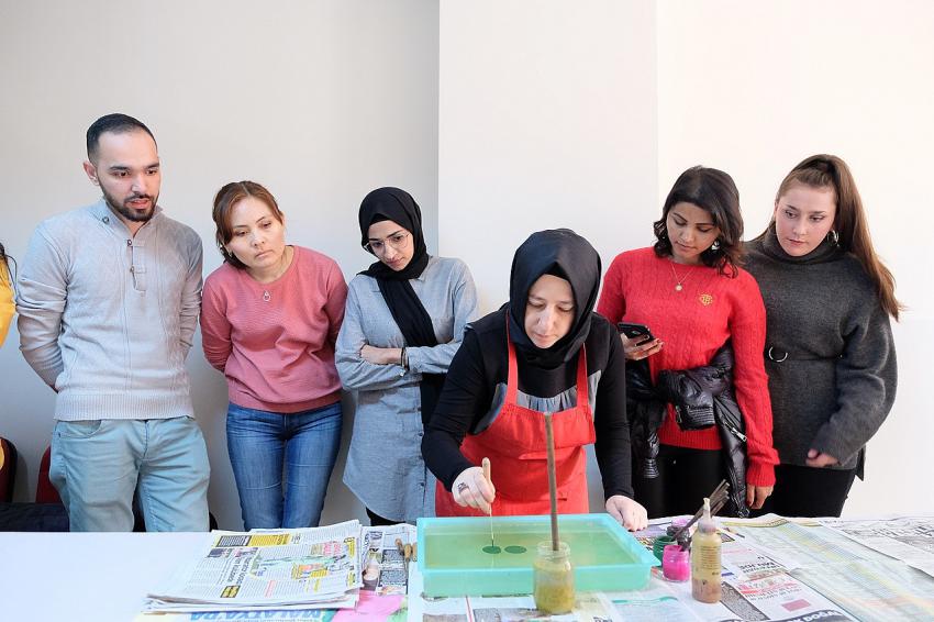 Türkçe ve Yabancı Dil Uygulama ve Araştırma Merkezi’nin (TÖMER) yürüttüğü çalışma kapsamında dünyanın dört bir yanından Türkiye’ye gelen yüze yakın öğrenci, BUSMEK tarafından düzenlenen ebru atölyesine katılarak geleneksel Türk İslam sanatını uygulama fırsatı buldular.