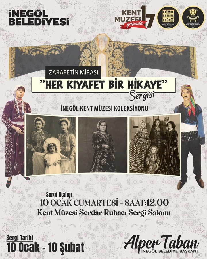 İnegöl Kent Müzesi, kuruluşunun 17’nci yılına özel olarak anlamlı bir sergiye ev sahipliği yapmaya hazırlanıyor. Her yıl kuruluş yıl dönümünü özel bir sergiyle kutlayan İnegöl Kent Müzesi, bu yıl “Zarafetin Mirası – Her Kıyafet Bir Hikaye” isimli sergiyle ilçe halkını buluşturacak. Sergi 10 Ocak Cumartesi günü saat 12.00’de İnegöl Kent Müzesi Serdar Rubacı Sergi Salonu’nda düzenlenecek açılışla görücüye çıkacak.