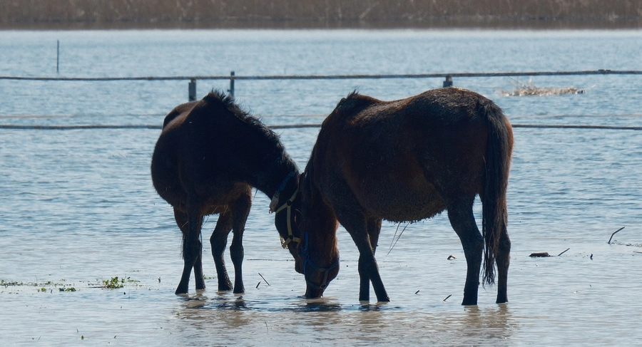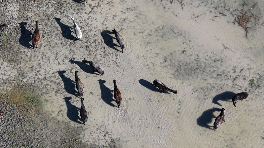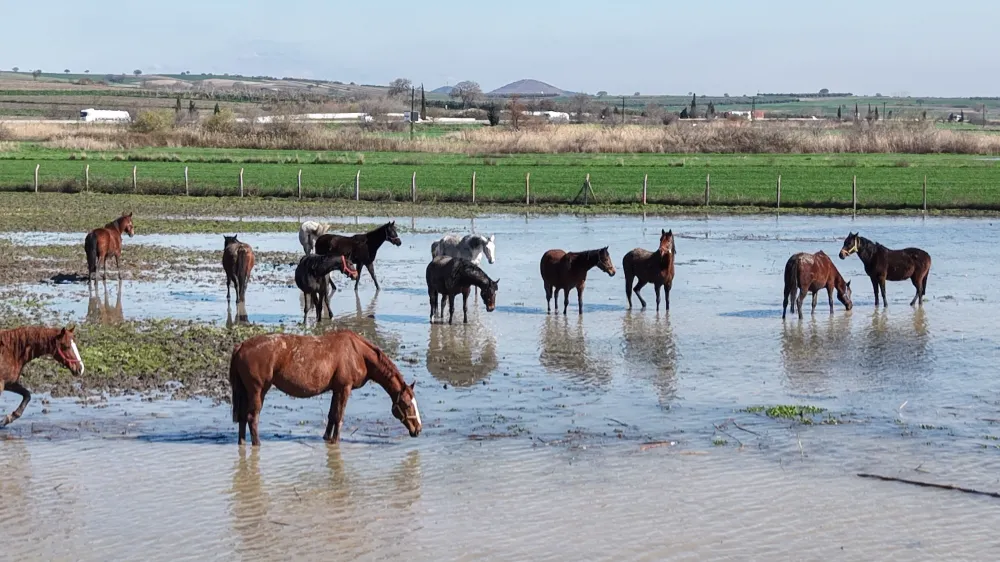Su altında kalan arazide dolaşan atlar drone ile görüntülendi. Özellikle milyonluk tayların annesi olan ve büyük kısmı gebe olan damızlık atların su içindeki görüntüsü dikkat çekti.
