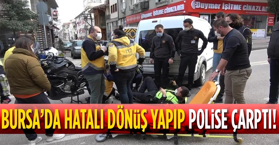 Bursa’da sokağa çıkma kısıtlamasında boş kalan yolda hatalı dönüş yapmak isteyen hafif ticari araç sürücüsü, motosikletli polis ekibine çarptı. Kazada Şahin ekibinde görevli polis memuru yaralandı.