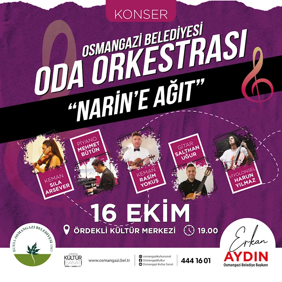 Osmangazi Belediyesi tarafından 16 Ekim Çarşamba günü saat 19.00’da gerçekleştirilecek olan Oda Orkestrası Konseri, Diyarbakır’da cinayete kurban giden 8 yaşındaki Narin Güran’a ağıt temasıyla gerçekleştirilecek.