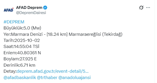 02 Ekim 2025 tarihinde saat 14.55’te kaydedilen depremin 6,71 km derinlikte gerçekleştiği bildirildi. Depremin merkez üssü Marmaraereğlisi’ne yaklaşık 18 kilometre mesafede bulunuyor.