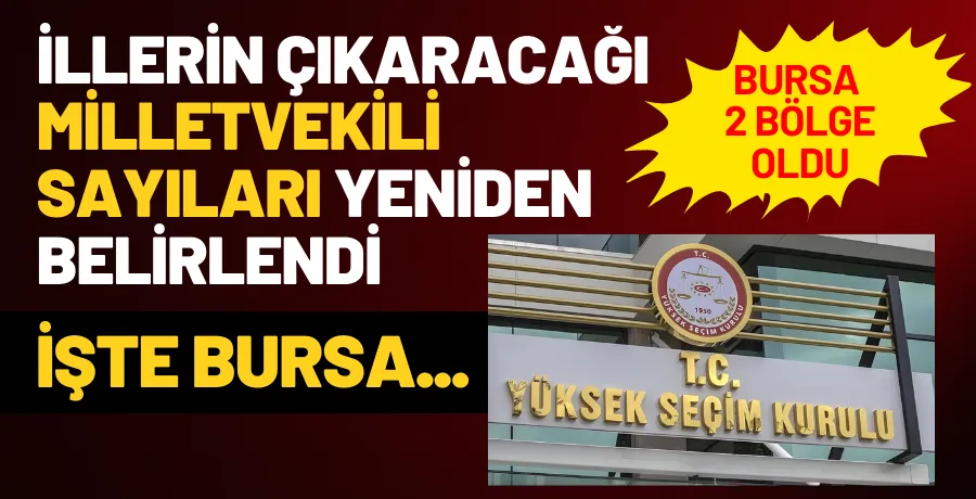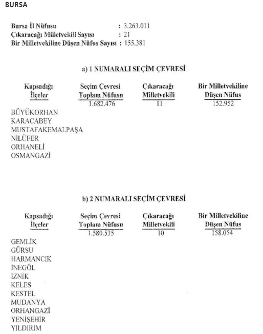 Bu kapsamda Bursa’nın çıkaracağı milletvekili sayısı 21 olarak belirlenirken, kent 2 seçim çevresine ayrıldı. 18’e kadar milletvekili çıkaran iller tek seçim çevresi sayılırken, 19-35 arası milletvekili çıkaran iller 2 seçim çevresine bölündü.