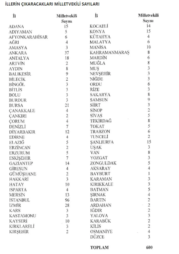 Türkiye İstatistik Kurumu’nun 31 Aralık 2025 tarihli nüfus verileri esas alınarak yapılan düzenlemeye göre, toplam 600 milletvekilliğinin dağılımında her ile 1 milletvekili garantisi verildi, kalan sandalyeler ise nüfusa göre paylaştırıldı.