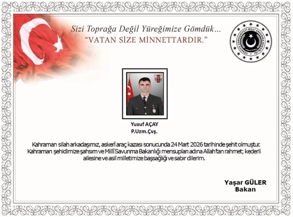 MSB'den yapılan açıklamada, "24 Mart'ta Ağrı / Doğubeyazıt'ta meydana gelen askeri araç kazasında, kahraman silah arkadaşımız Piyade Uzman Çavuş Yusuf Açay şehit olmuştur" ifaderine yer verdi.