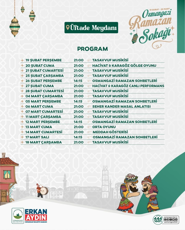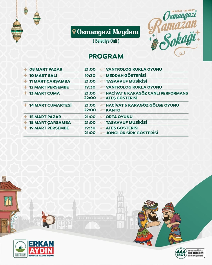 Osmangazi Ramazan Sokağı, birlik ve dayanışma duygularının yoğun şekilde hissedileceği buluşma noktalarından biri olacak. Geleneksel el sanatları, sahne performansları, tasavvuf musikisi dinletileri ve çocuklara yönelik aktivitelerle ilçede Ramazan geceleri adeta festival havasında yaşanacak. Etkinlik programında Karagöz ve Hacivat gölge oyunları, canlı sahne performansları, meddah anlatımları, orta oyunları, vantrolog kukla gösterileri ile Aşuk ile Maşuk performansları yer alacak. Ateş ve jonglör gösterileri ise geceye görsel bir zenginlik katacak.