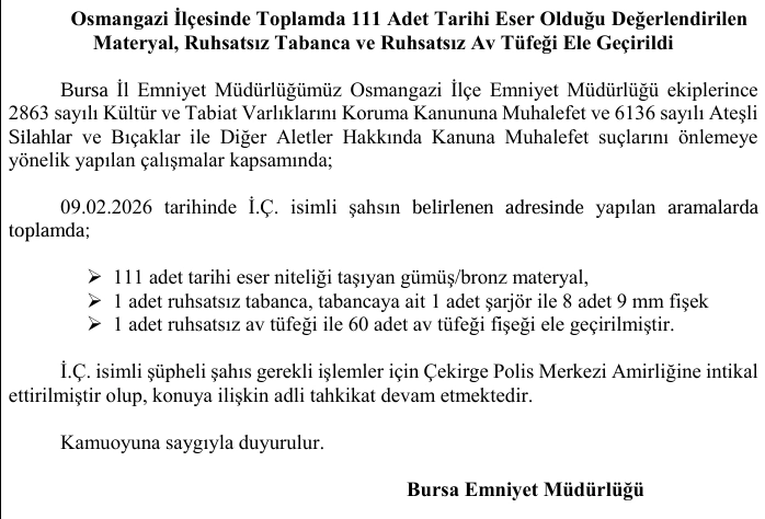 09 Şubat 2026 tarihinde İ.Ç. isimli şahsın adresinde yapılan aramalarda, 111 adet tarihi eser niteliği taşıdığı değerlendirilen gümüş ve bronz materyal ele geçirildi. Ayrıca aramada, 1 ruhsatsız tabanca, tabancaya ait şarjör ve 8 adet 9 mm fişek ile 1 ruhsatsız av tüfeği ve 60 adet av tüfeği fişeği bulundu.