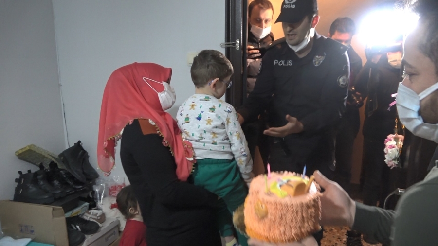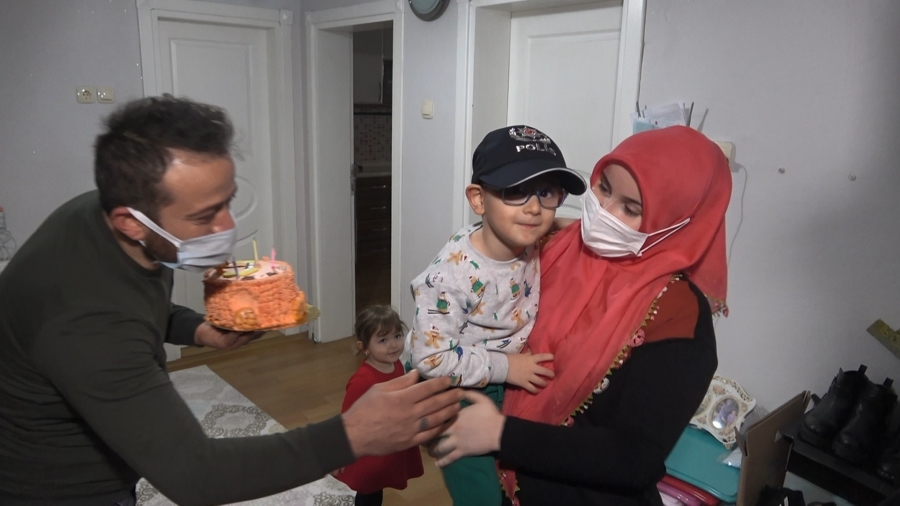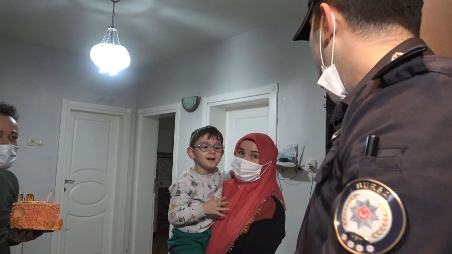 Bursa'da hafta sonu kısıtlamasında dışarıya çıkamayan Şana çifti, polisleri çok seven serebral palsi hastası oğulları 5 yaşındaki Mehmet Akif için doğum günü dolayısıyla polis ekiplerinden yardım istedi. Şana çiftinin isteğini geri çevirmeyen ekipleri ellerinde pasta ile kapıda gören Mehmet Akif mutluluktan havaya uçtu.
