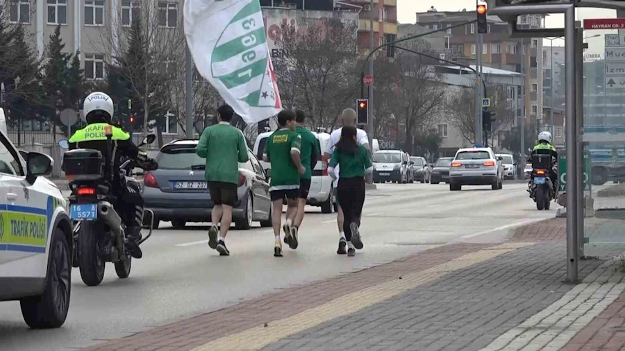Maraton koşucusu Yasin Avcı ve 4 sporcu, ‘Sevgiliye Koşuyoruz’ sloganıyla Atatürk Spor Kompleksi Matlı Stadyumu önünden Bursaspor İbrahim Yazıcı Özlüce Tesisleri’ne kadar yaklaşık 8 kilometre koştu. 4 metrelik Bursaspor bayrağı ile koşan Yasin Avcı ve 4 sporcuya polis ekibi de eşlik etti. Avcı ile arkadaşlarına yoldaki sürücüler de el sallayarak ve korna çalarak destek verdi.