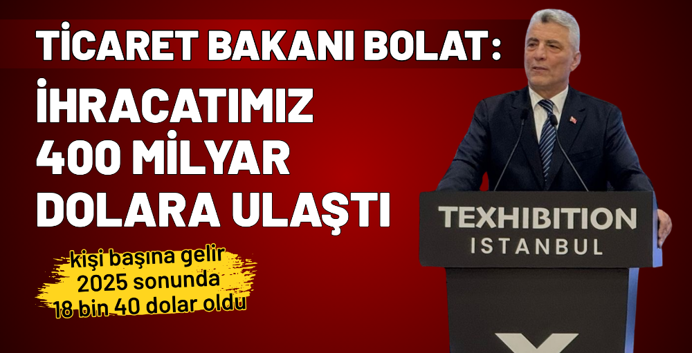 Bakan Bolat sözlerini, “Türkiye, Avrupa ülkeleriyle karşılaştırıldığında büyüme yarışında ilk üçte. Milli gelirimiz 1,6 trilyon dolara ulaştı, kişi başına gelir 2025 sonunda 18 bin 40 dolar oldu. Mal ve hizmet ihracatımız 400 milyar dolara çıktı. Tüm bu başarı halkımızın takdirini kazanıyor, onlara minnettarız” diyerek tamamladı.