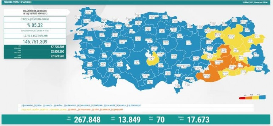 Sağlık Bakanlığı, koronavirüs için son gelişmeleri ve günlük tabloyu paylaştı. Tabloya göre son 24 saatte 267 bin 848 Kovid-19 testi yapıldı, 13 bin 849 kişinin testi pozitif çıktı, 70 kişi hayatını kaybetti.