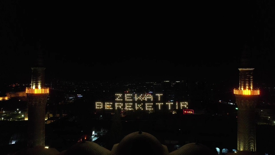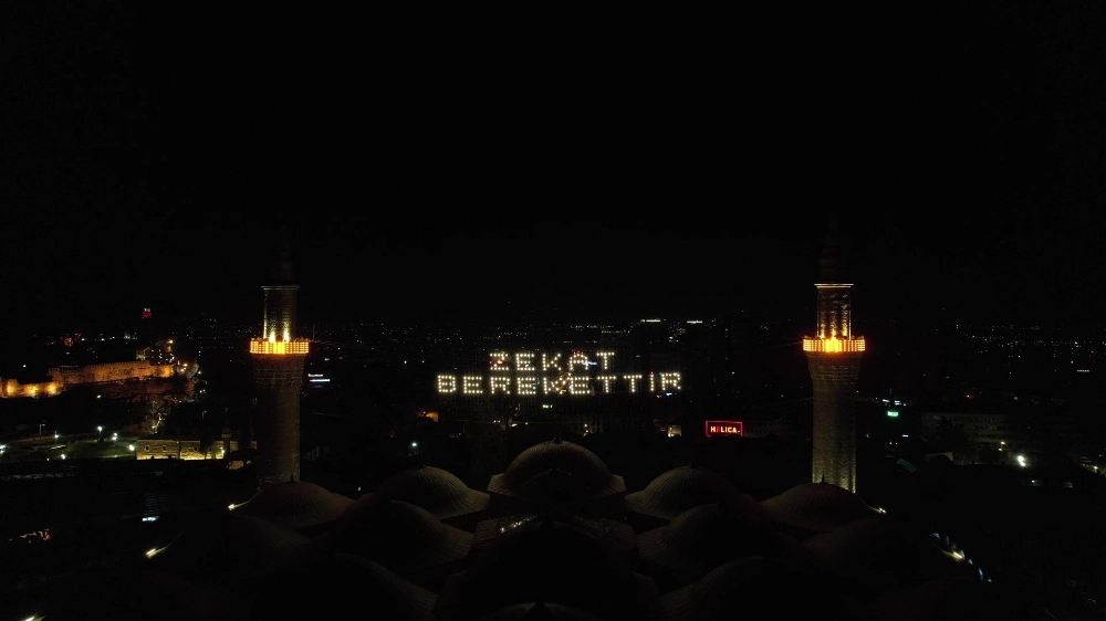 Ramazan ayının başında minareler arasına asılan “Kul hakkından sakın” yazılı mahya, yerini “Zekat Berekettir” yazısına bıraktı. Tarihi Ulu Cami’nin iki minaresi arasındaki yaklaşık 70 metrelik mesafeye kurulan mahya, gece boyunca ışıklarıyla dikkat çekti.