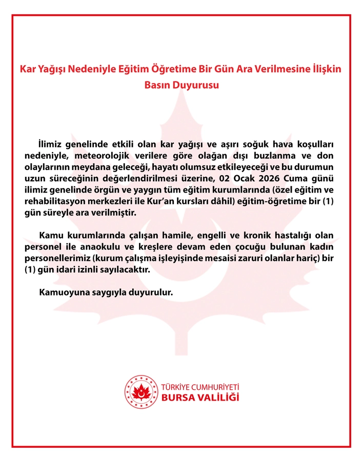 Meteorolojik veriler doğrultusunda buzlanma ve don olaylarının hayatı olumsuz etkileyeceği değerlendirilerek, 2 Ocak 2026 Cuma günü il genelindeki tüm resmi ve özel eğitim kurumlarında eğitim öğretime ara verildi.