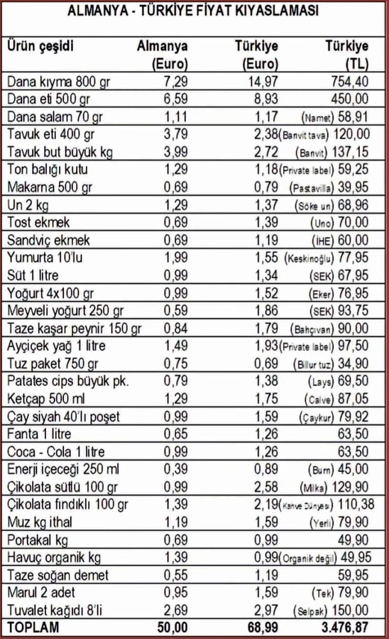 Asgari ücretin Türk parasıyla yaklaşık 100 bin lira olduğu Almanya ile asgari ücretin 28 bin lira olduğu ülkemiz arasında, bazı ürünleri karşılaştıran fiyat tablosu beni şaşırtmadı.