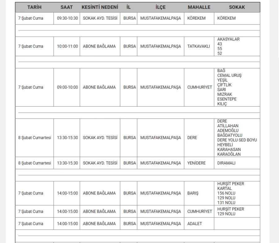 7 Şubat 2025 Cuma günü Bursa'da planlı elektrik kesintileri gerçekleştirecektir. Kesintiler, Gürsu, İnegöl, Karacabey, Kestel, Mudanya, Mustafakemalpaşa, Nilüfer, Osmangazi, Yenişehir ve Yıldırım ilçelerinde yapılacaktır.