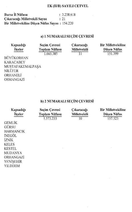 Ankara, İstanbul ve İzmir’deki seçim bölgeleri korunurken, Ankara 3, Bursa 2, İstanbul 3, İzmir 2 seçim bölgesine ayrıldı.