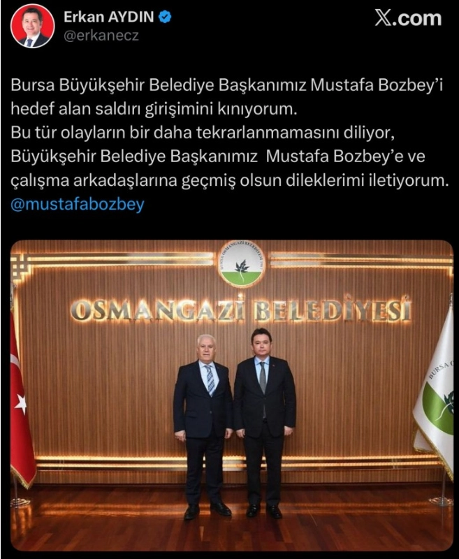 Osmangazi Belediye Başkanı Erkan Aydın, “Bursa Büyükşehir Belediye Başkanımız Mustafa Bozbey'i hedef alan saldırı girişimini kınıyorum. Bu tür olayların bir daha tekrarlanmamasını diliyor, Büyükşehir Belediye Başkanımız Mustafa Bozbey'e ve çalışma arkadaşlarına geçmiş olsun dileklerimi iletiyorum” dedi.