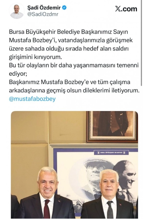 Nilüfer Belediye Başkanı Şadi Özdemir, "Bursa Büyükşehir Belediye Başkanımız Sayın Mustafa Bozbey'i, vatandaşlarımızla görüşmek üzere sahada olduğu sırada hedef alan saldırı girişimini kınıyorum.