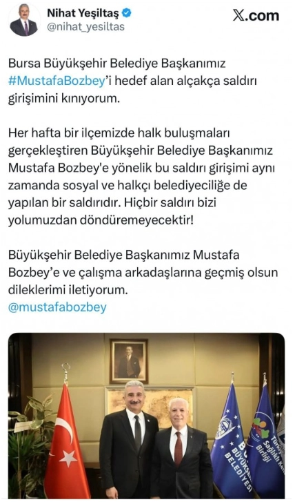 CHP Bursa İl Başkanı Nihat Yeşiltaş, "Bursa Büyükşehir Belediye Başkanımız Mustafa Bozbey'i hedef alan alçakça saldırı girişimini kınıyorum. Her hafta bir ilçemizde halk buluşmaları gerçekleştiren Büyükşehir Belediye Başkanımız Mustafa Bozbey'e yönelik bu saldırı girişimi aynı zamanda sosyal ve halkçı belediyeciliğe de yapılan bir saldırıdır. Hiçbir saldırı bizi yolumuzdan döndüremeyecektir. Büyükşehir Belediye Başkanımız Mustafa Bozbey'e ve çalışma arkadaşlarına geçmiş olsun dileklerimi iletiyorum" ifadelerini kullandı.