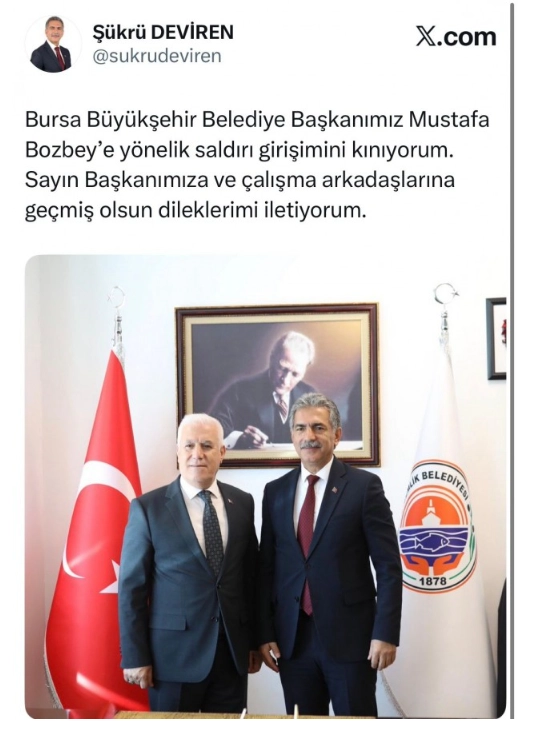 Gemlik Belediye Başkanı Şükrü Deviren, "Bursa Büyükşehir Belediye Başkanımız Mustafa Bozbey'e yönelik saldırı girişimini kınıyorum.