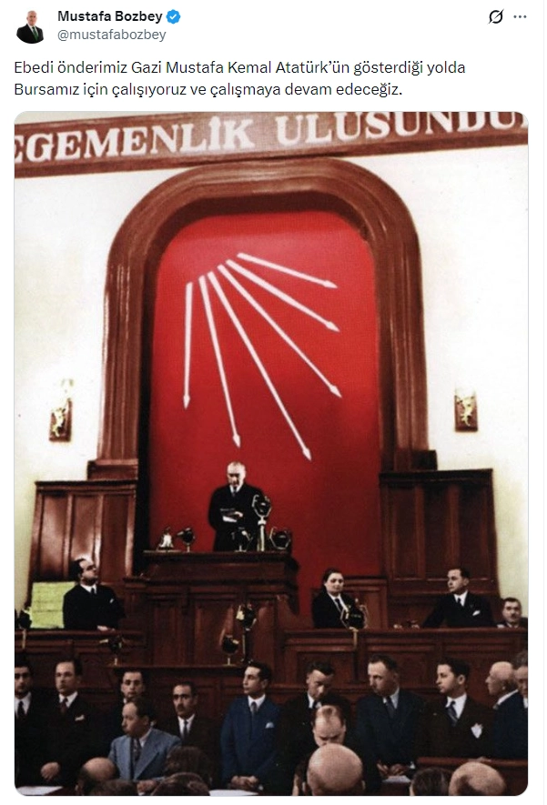 Bozbey’in paylaşımında yer alan görselde, Mustafa Kemal Atatürk’ün TBMM’de konuşma yaptığı tarihi bir kare yer aldı. Paylaşım, Bozbey’in görevine bağlılığını ve çalışmalarına devam edeceğini vurgulaması olarak yorumlandı.