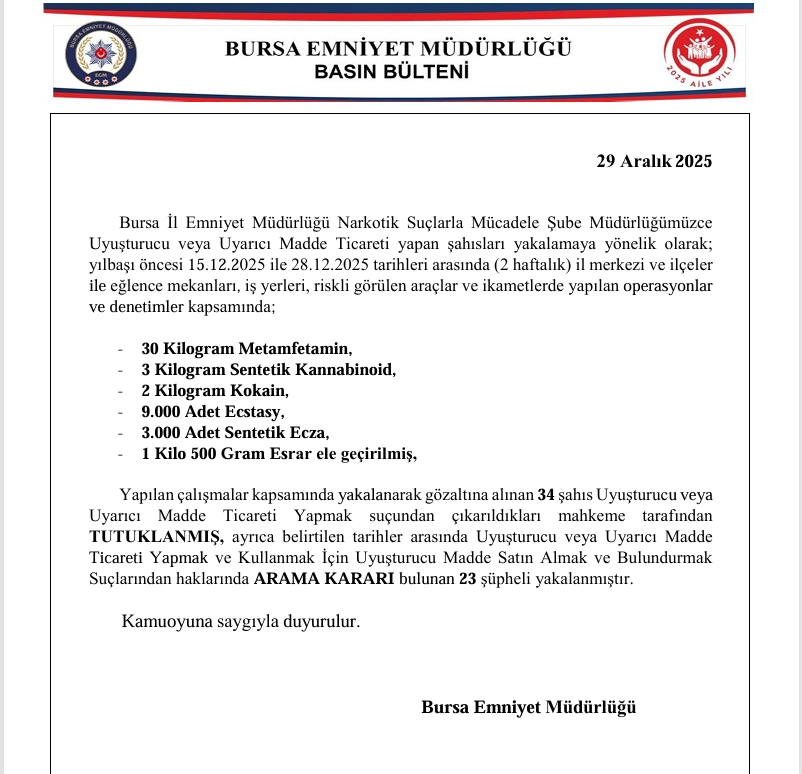 15 Aralık–28 Aralık 2025 tarihleri arasında, il merkezi ve ilçeler ile eğlence mekânları, iş yerleri, riskli görülen araçlar ve ikametlerde gerçekleştirilen operasyon ve denetimlerde önemli miktarda uyuşturucu madde ele geçirildi. Yapılan çalışmalarda 30 kilogram metamfetamin, 3 kilogram sentetik kannabinoid, 2 kilogram kokain, 9 bin adet ecstasy, 3 bin adet sentetik ecza ve 1 kilo 500 gram esrar yakalandı.