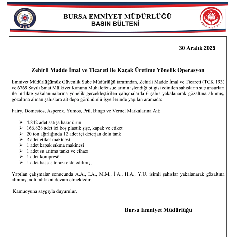 30 Aralık 2025 tarihinde gerçekleştirilen çalışmalarda toplam 12 şüpheli yakalanarak gözaltına alındı.