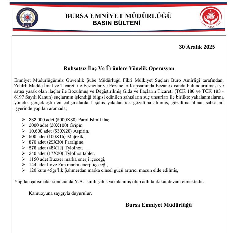 Ruhsatsız ilaç ve ürünlere yönelik bir diğer operasyonda ise eczane dışında bulundurulması ve satışı yasak olan çok sayıda ürün ele geçirildi. Bir iş yerinde yapılan aramada, 232 bin adet Parol, binlerce adet Gripin, Aspirin, Majezik, Paralgine ve Tylolhot ile birlikte enerji içecekleri ve cinsel gücü artırıcı macunlara el konuldu. Olayla ilgili 1 şüpheli yakalanarak gözaltına alındı.