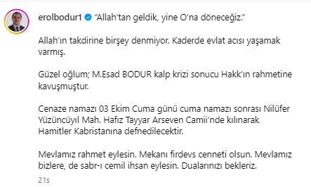 Erol Bodur sosyal medya hesabından yaptığı paylaşımda şu ifadelere yer verdi: